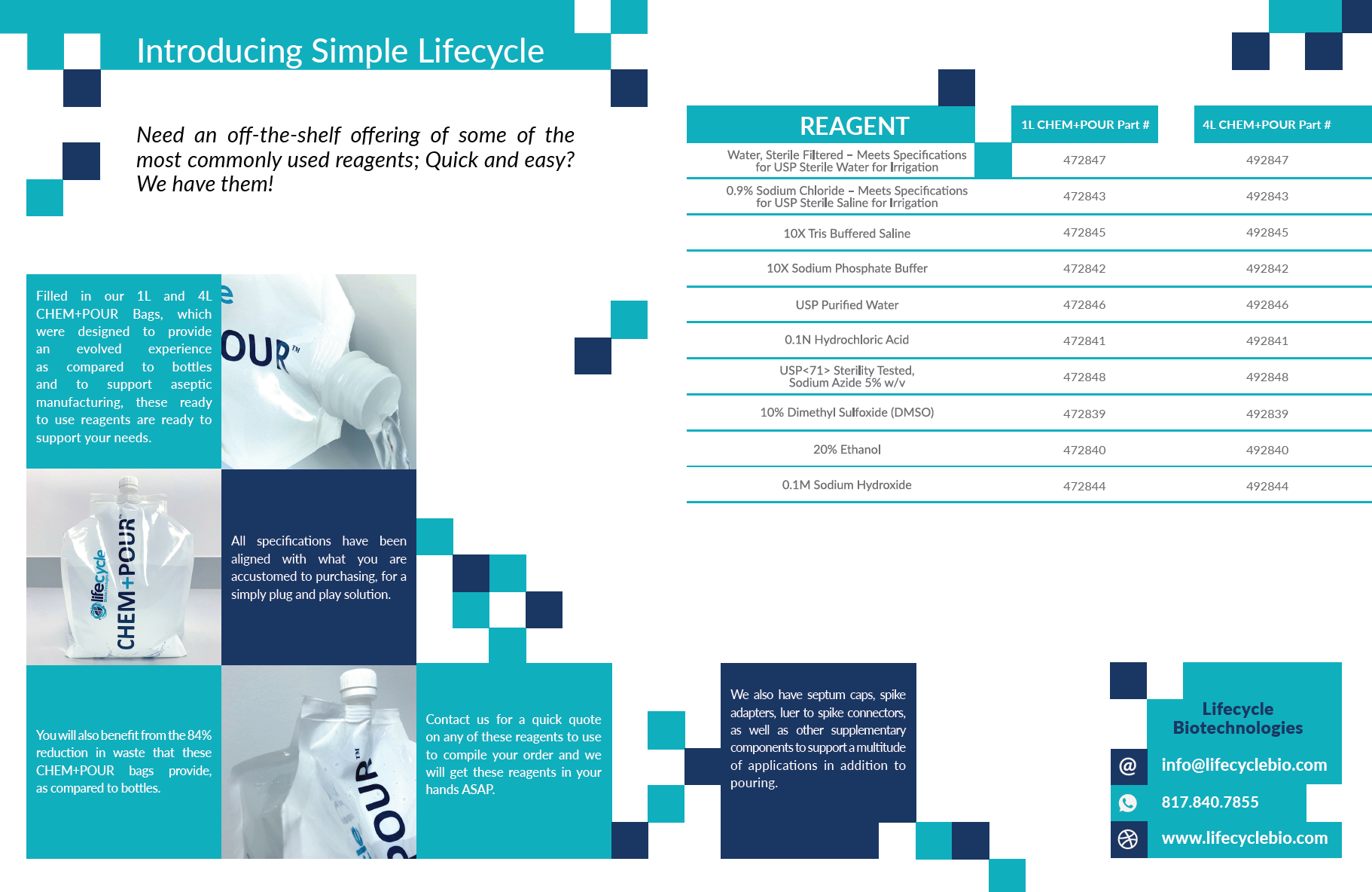 Our premise for delivering these quality products is simple. We always maintain the highest levels of quality when it comes to our production and we have advanced custom-engineered packaging system available for delivering the reagents in a manner ideal to each customer’s process.